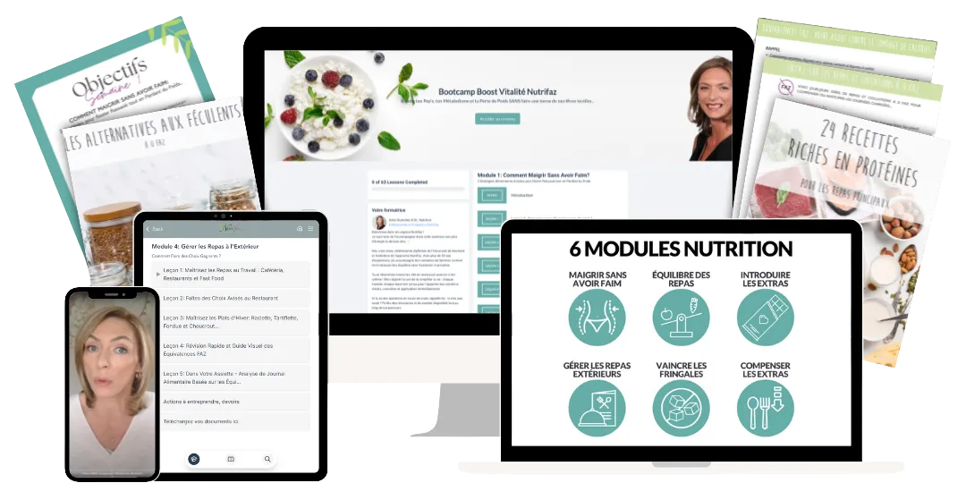 Des capsules vidéos ultra concises, claires et divisées en 6 modules pour comprendre ce qu’il faut vraiment manger pour perdre tes kilos pendant la transition hormonale